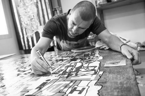 Véritable travail de fourmis mêlant acrylique, collage et marqueurs, chaque toile est une invitation aux rêves où les images parlent d’elles-mêmes et jouent avec les regards, poussant à trouver des liens vers plus de profondeur…