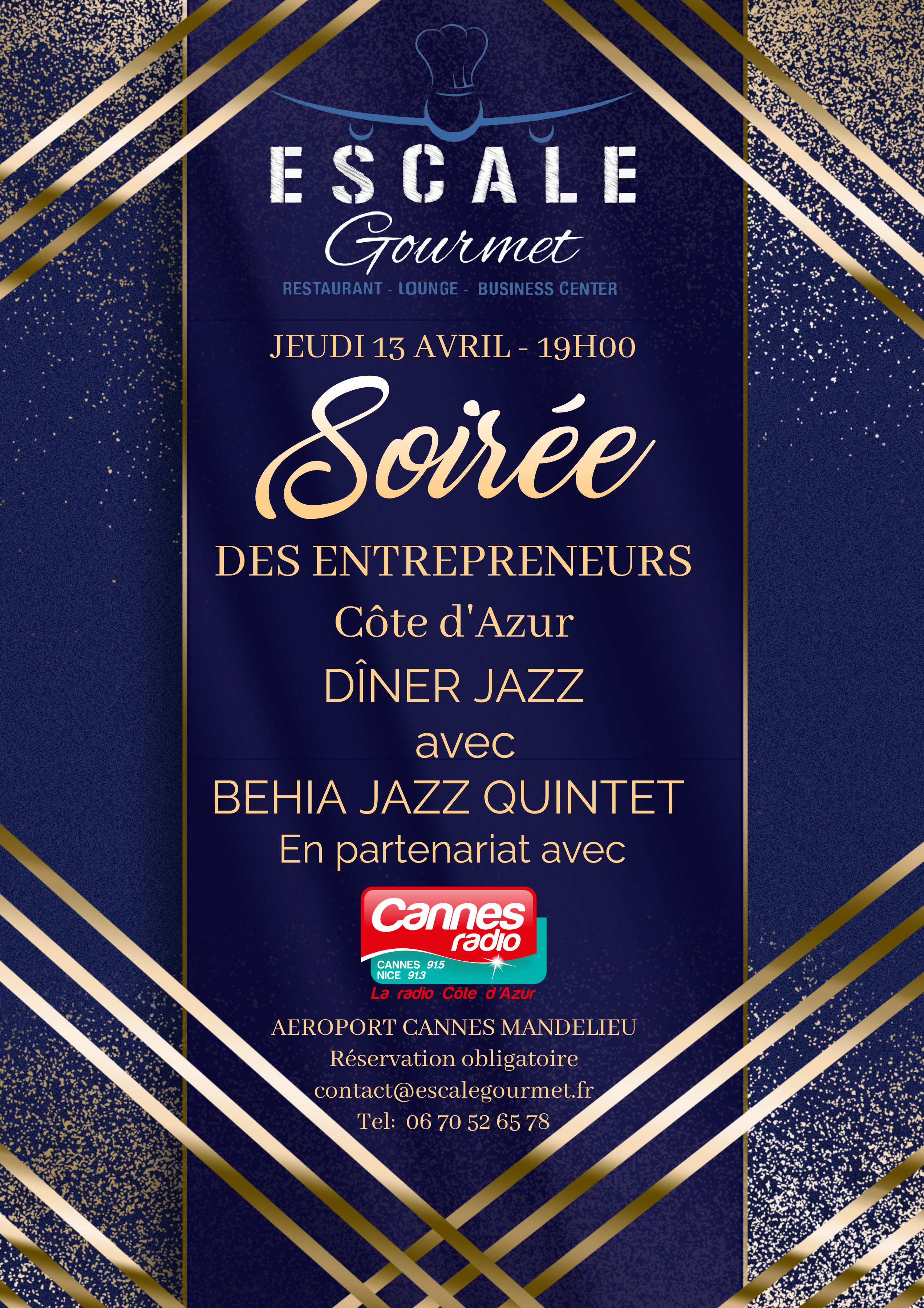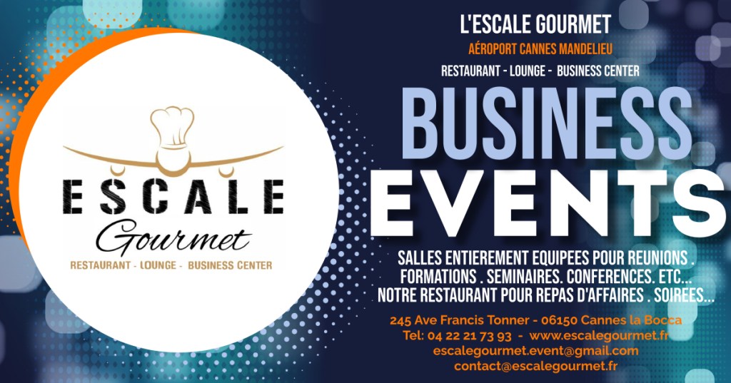 Jeudi 13 Avril à partir de 19h, l’Aéroport de Cannes Mandelieu, vous accueille dans son Restaurant Escale Gourmet, avec vue panoramique sur les pistes pour un Dîner Jazz Exclusif à l’occasion de la Soirée des entrepreneurs Côte d’Azur.